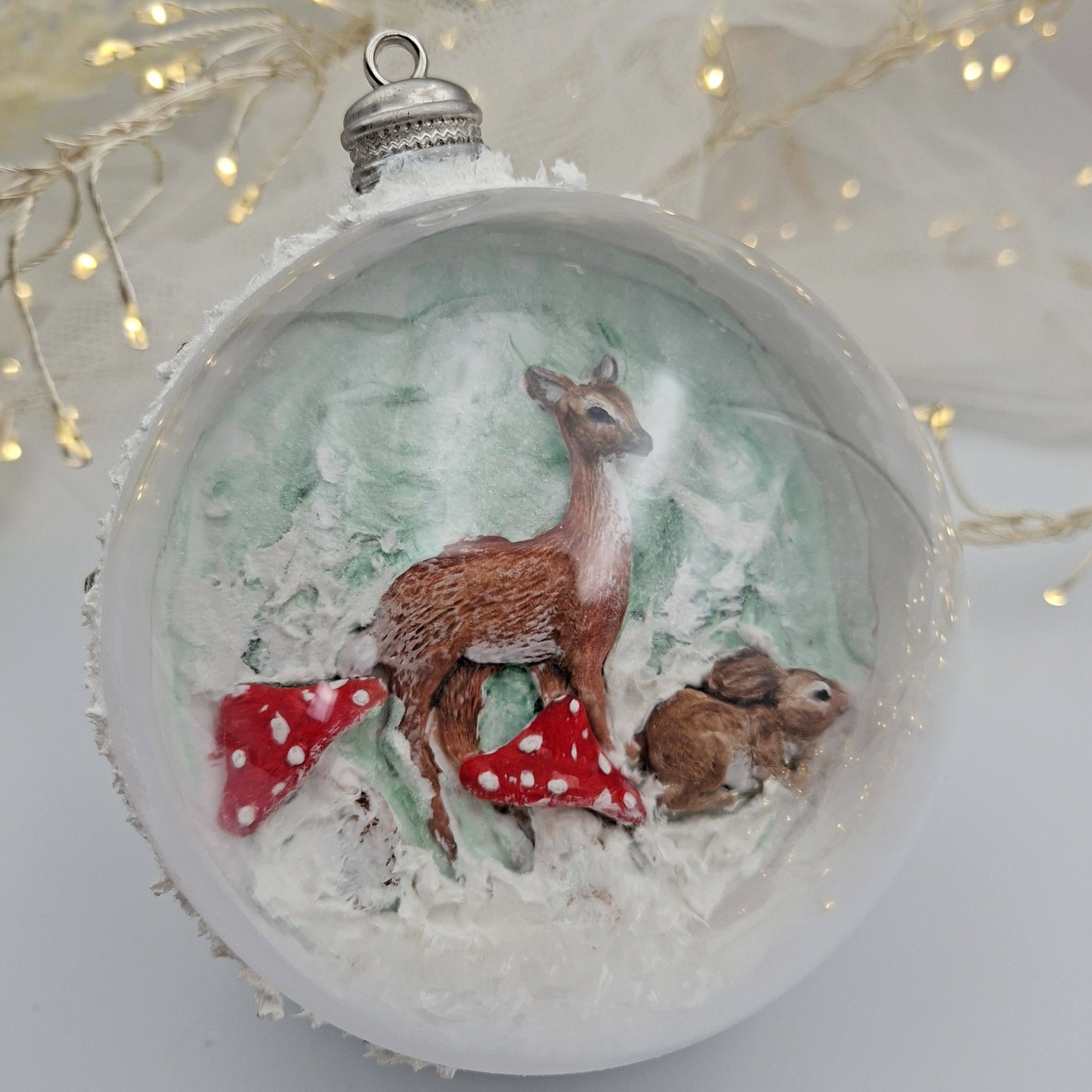 Bombka akrylowa, ręcznie dekorowana masą samoutwardzalną, ręcznie malowana. Zdobienie wewnątrz bombki.