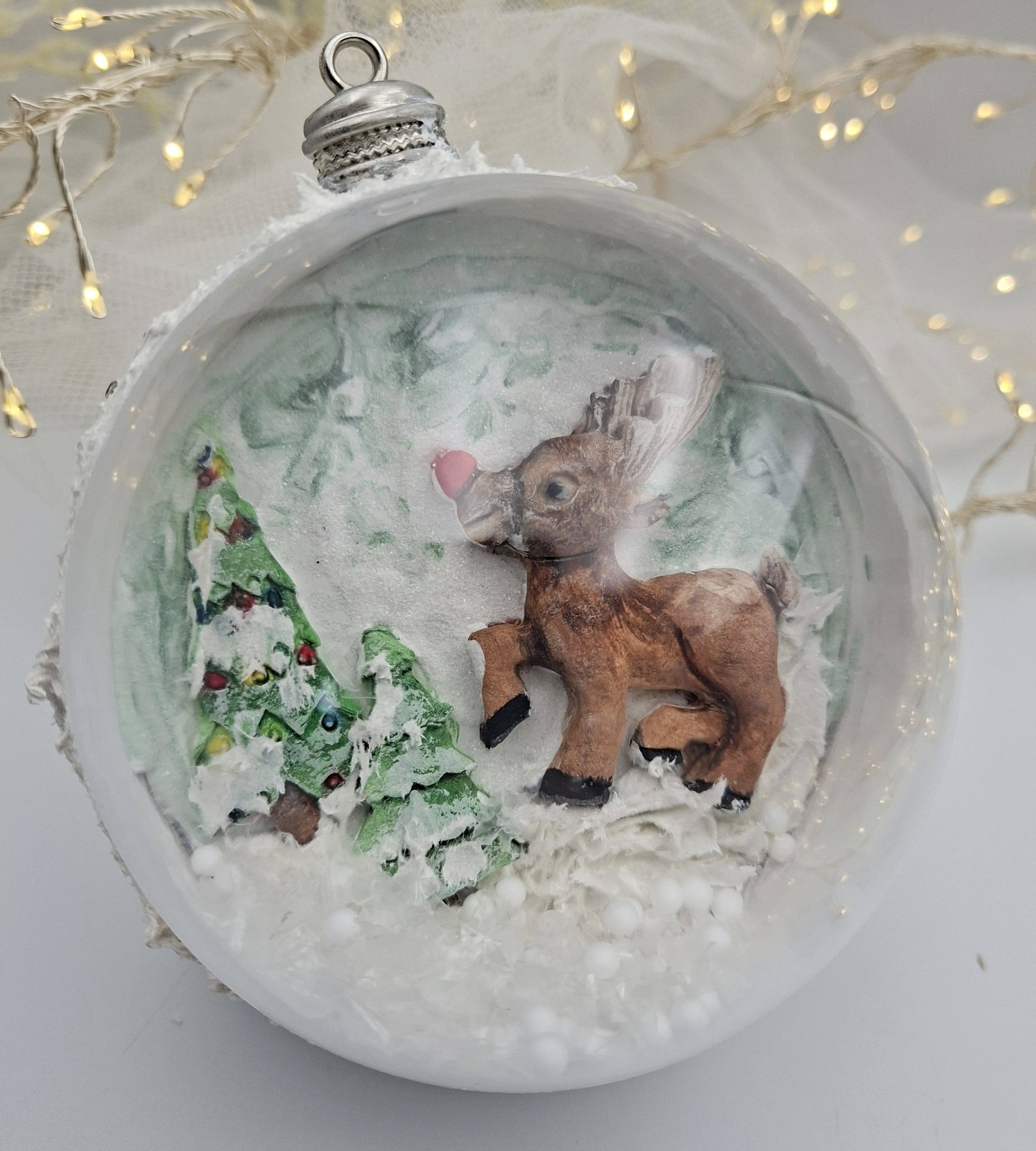 Bombka akrylowa, ręcznie dekorowana masą samoutwardzalną, ręcznie malowana. Zdobienie wewnątrz bombki.