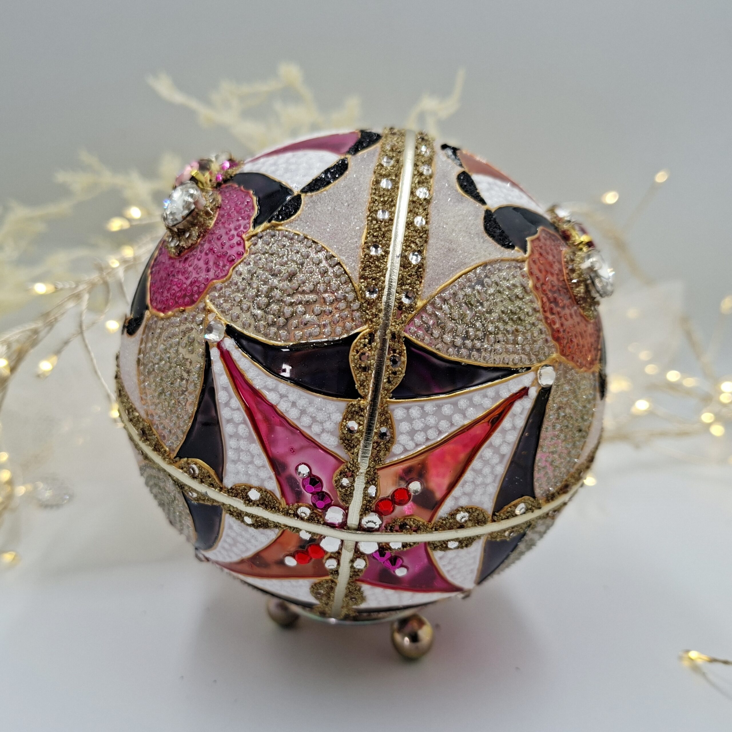 Bombka ręcznie malowana techniką witrażową i zdobiona cyrkoniami i brokatem. Średnica 12cm.