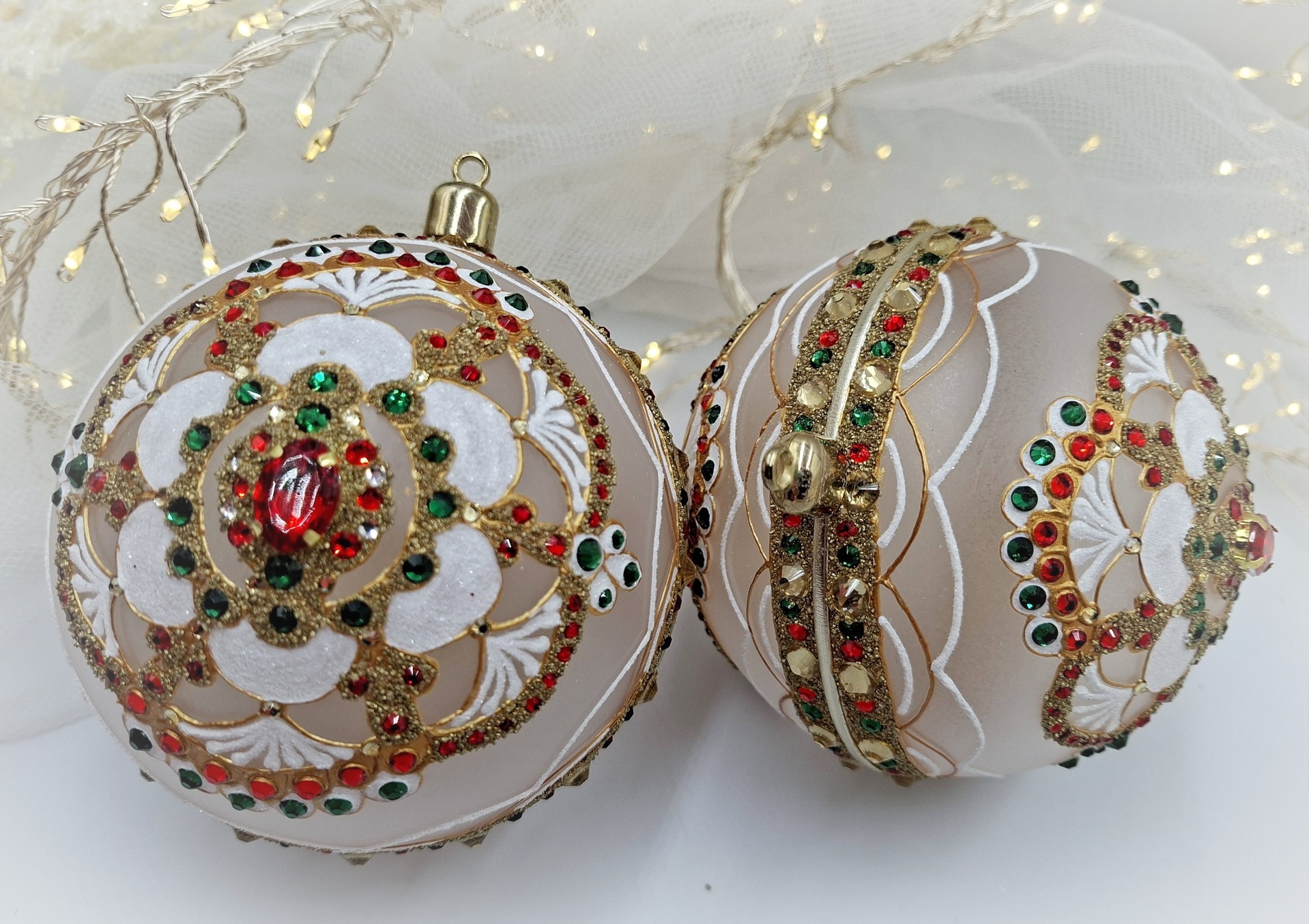 Bombka akrylowa, malowany wzór koronki bogato zdobiony szklanymi cyrkoniami. Średnica 10cm. Film: https://www.facebook.com/reel/2199399180584447